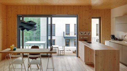 Die Architekten nutzten die Möglichkeit erstmals bei ihrem im Mai 2020 fertiggestellten Projekt „Walden 48“, das sie zusammen mit der Architektin Anne Raupach planten. Dafür musste der für das Baugruppenprojekt im Berliner Stadtteil Friedrichshain zuständige Brandschutzplaner Reinhard Eberl-Pacan einen Antrag auf Abweichung mit Bezug auf die Landesbauordnung Baden-Württemberg stellen. Bei entsprechender Bemessung der Konstruktionshölzer ist somit keine Bekleidung von Decken und Wänden notwendig. „Leider erlauben das bislang die wenigsten Bauordnungen der Länder. In der Musterbauordnung und in einigen Bundesländern sind lediglich entsprechende Novellierungen geplant“, beschreibt Reinhard Eberl-Pacan den Stand der Dinge.