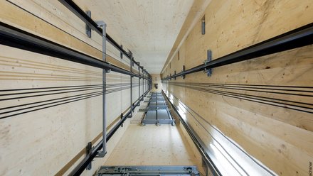 Dass man für den Aufzugsschacht ebenfalls Holz verwenden kann, ist in der Entwicklungsgeschichte der Bauweise relativ neu. Scharabi Architekten fanden ursprünglich lediglich einen Aufzughersteller, der bereits einen Aufzug in einem Holzschacht realisiert hatte und der daher den Auftrag für das Projekt „Walden 48“ erhielt. Der hier gemessene Wert war drei Dezibel niedriger als der geforderte Wert. So sehen sich Scharabi Architekten auch immer wieder als Impulsgeber und Mutmacher, bislang nicht praktizierte bautechnische Anwendungen in die Tat umzusetzen. „So können jetzt auch andere am Holzbau Interessierte von unseren Erfahrungen profitieren“, sagt Susanne Scharabi.