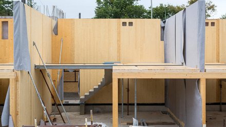 Ebenso unabdingbar ist ein versierter Fachplaner für Schallschutz und Akustik. Im Vergleich zu massiven Baustoffen ist Holz durch sein geringeres Gewicht für Schallwellen deutlich leichter zu durchdringen; auch durch Bauteilfugen und auf zahllosen Nebenwegen. „Dennoch lassen sich durch intelligente Planung sogar bessere Werte als beim Massivbau erzielen“, berichtet Farid Scharabi. Weil ein guter Schallschutz gerade bei Eigentumswohnungen eine wichtige Rolle spielt, lassen die Architekten nach Fertigstellung ihrer Gebäude regelmäßig Schallmessungen von Wänden und Decken durchführen. Beim Projekt „Walden 48“ wurde der Schallschutz zwischen den Wohnungen und dem hölzernen Aufzugsschacht gemessen.