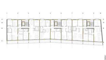 Den wohl größten Kompromiss erforderte das erste Projekt „Wohnen an der Barnimkante“. Das Wohn- und Geschäftshaus war ursprünglich als komplettes Holzgebäude konzipiert, realisiert wurde aber eine Hybridkonstruktion mit tragenden Stahlstützen in der Fassade und Spannbeton-Fertigteildecken. Den Ausgangspunkt hierfür bildete die zum Nachbargebäude einzuhaltende Traufhöhe. Bei Verwendung der deutlich dickeren reinen Holzdecken hätte man in Summe ein Geschoss weniger errichten können. Aus Sicht der Vermarktung wollte man darauf nicht verzichten, zumal die Hybridkonstruktion dank weitestgehend stützenfreier Räume die gewünschte Grundrissflexibilität und brandschutztechnische Vorteile bot. Damals erforderte die reine Holzbauweise noch eine Sprinkleranlage, was potenzielle Käufer von Wohnungen wohl eher abgeschreckt hätte, so die Befürchtung. Die Alternative, die Holzkonstruktion zu kapseln, schlossen die Architekten aus. Farid Scharabi: „Holz soll dort, wo es tragend wirkt, sichtbar bleiben. Das ist unsere Haltung.“