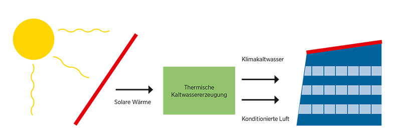 Bei der solaren Klimatisierung wird die Sonnenstrahlung vor allem zur Erzeugung von Kälte genutzt. Es handelt sich hier nicht um elektrische Kühlungssysteme, die über gekoppelte Photovoltaiksysteme mit Strom versorgt werden. Zur praktischen Umsetzung gibt es verschiedene Möglichkeiten wie Ab- und Adsorptionskälteanlagen. Bei größeren Gebäuden mit hoher Personendichte bieten sich Sorptionsklimasysteme an.Je nach verwendeter Technologie wird ab einem solaren Deckungsgrad von 25 bis 40 Prozent die Schwelle erreicht, die eine Primärenergieeinsparung ermöglicht. Adsorptionsklimaanlagen stehen in Leistungsgrößen ab fünf kW zur Verfügung und sind damit schon für Einfamilienhäuser geeignet. Mit der solaren Klimatisierung lässt sich aber vor allem im Nichtwohnbereich Energie sparen, weil hier der Kühlbedarf wesentlich höher ist.