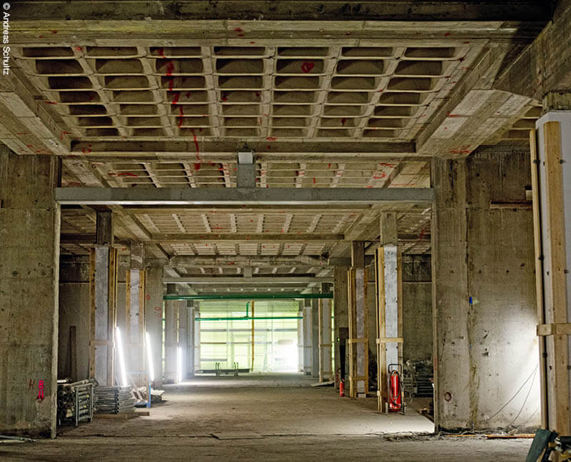 Bei der nicht sonderlich hohen Betonqualität der 1960er-Jahre verwunderte es nicht, dass die Bewehrung in vielen Bereichen im Untergeschoss korrodiert und folglich der Beton abgesprengt war.