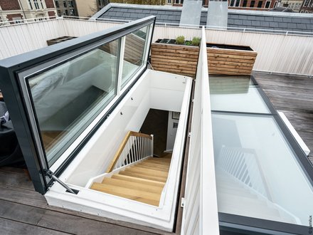 Freitreppe mit grasbedeckten Seitenflächen vor einem modernen, geschwungenen Gebäude mit weißer Fassade und dunklem Unterbau.