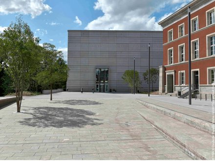 Blick über eine große, gepflasterte Fläche auf ein modernes Gebäude mit schrägen Stützen und Glasfassade, im Hintergrund Stadtgebäude und Bäume.