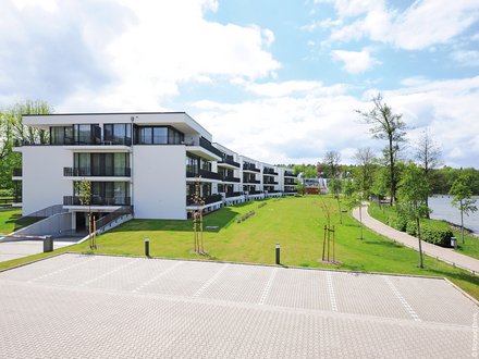 Freitreppe mit grasbedeckten Seitenflächen vor einem modernen, geschwungenen Gebäude mit weißer Fassade und dunklem Unterbau.