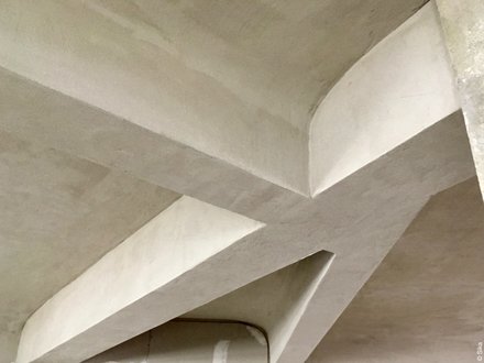 Freitreppe mit grasbedeckten Seitenflächen vor einem modernen, geschwungenen Gebäude mit weißer Fassade und dunklem Unterbau.