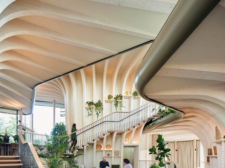 Freitreppe mit grasbedeckten Seitenflächen vor einem modernen, geschwungenen Gebäude mit weißer Fassade und dunklem Unterbau.