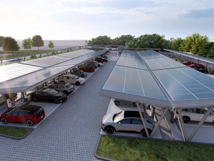Photovoltaik über Parkplätzen mit Ladestation kombiniert