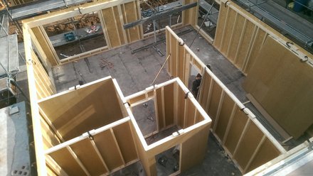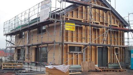 Ein Holzrahmenbau aus vorgefertigten Holztafeln (hier einseitig beplankt) ist relativ materialsparsam. © Gerrit Horn