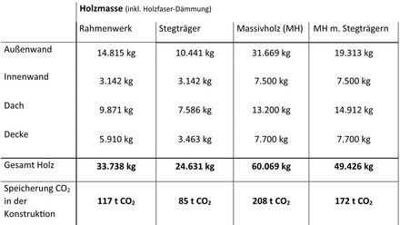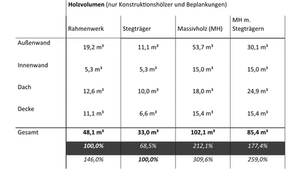 Bei der Wahl der Holzkonstruktionsart für ein Gebäude lohnt sich der Blick auf die einzubauende Holzmenge. Holzrahmenbauten mit Holzstegträgern weisen beispielsweise im reinen Anteil des Konstruktionsholzes lediglich ein Viertel des Holzeinsatzes von Massivholzkonstruktionen auf. Berücksichtigt man auch die für das Gebäude notwendigen Holzwerkstoffplatten, so liegt der Unterschied der benötigten Holzmenge bei den unterschiedlichen Holzbauweisen bei einem Faktor von drei (siehe Tabelle 1).