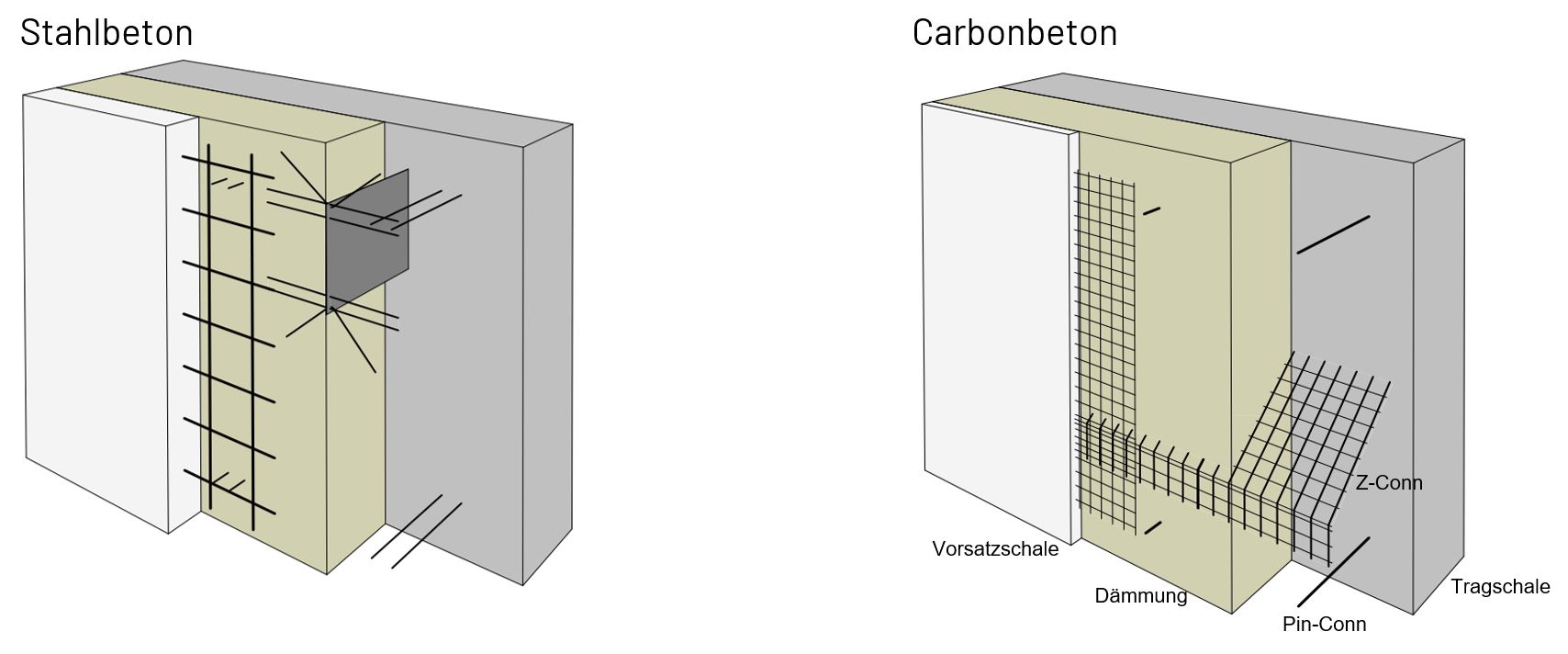 Aufbau des Fertigteils mit Carbonbewehrung (rechts) im Vergleich zu einem herkömmlichen Fertigteil.