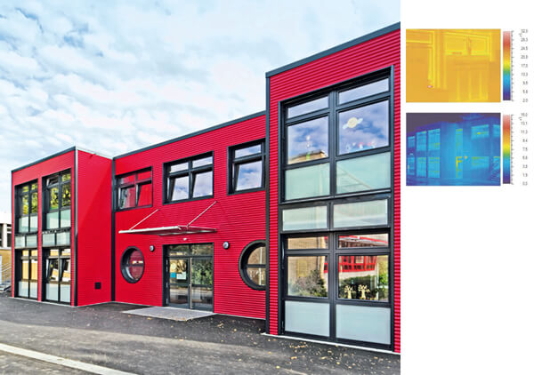 Der Neubau zur Erweiterung der Klassenräume der Edith-Stein-Schule aus dem nordrhein-westfälischen Frechen ist ein Beispiel dafür, dass Modulgebäude auch beim Wärmeschutz anderen Bauweisen nicht nachstehen. In diesem Fall hat die ausführende Firma Säbu aus Morsbach (NRW) das Gebäude thermografisch untersucht, um mögliche thermische Schwachstellen in der Wandkonstruktion zu lokalisieren. Hierbei wurden Aufnahmen von innen und von außen vorgenommen und dokumentiert.
