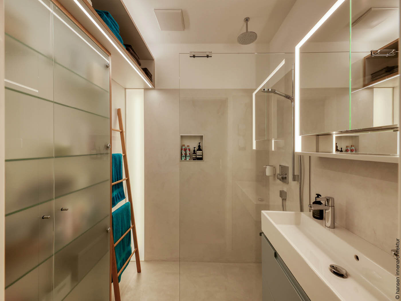 Das Bad wurde komplett entkernt und der alte Fliesenbelag entfernt. Mit seinen geringen Abmessungen bei einer Raumhöhe von 3,34 Metern verfügte der Raum über ungünstige Proportionen. Die Decke wurde daher abgehängt und in dem Zwischenraum die Lüftung und die Kopfbrause installiert. Da der Anschluss an das Fallrohr sehr tief lag, ließ sich die Dusche bodeneben ausführen. Ob das möglich ist oder nicht, stellt sich wie in diesem Fall oft erst beim Abriss heraus. Außerdem erlaubte der Bodenaufbau den Einbau einer Fußbodenheizung – und damit den Verzicht auf einen platzraubenden Handtuchheizkörper. Der vorhandene Durchlauferhitzer wurde gegen ein kleineres, aber leistungsstärkeres und elektronisch gesteuertes Modell ausgetauscht. Er ist, ebenso wie der Verteiler für die Fußbodenheizung, in einem nur 20 Zentimeter tiefen Schrank mit Mattglastüren versteckt. Darauf aufgesetzt ist ein tieferes Regal für die Handtücher. Unter dem Waschbecken schaffen zwei große Auszüge mit integrierten Steckdosen zusätzlich Stauraum.