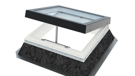 Für Gebäude, die gestalterisch anspruchsvolle Lösungen für Belichtung, Belüftung und Rauchabzug erfordern, bietet Velux jetzt mit „Top 100 Glass“ ein elegantes Flachdachfenster an. Es vereint mit hochwertigem Glasaufsatz sowie vorgefertigten, gedämmten Metall- oder GFK-Aufsetzkränzen Energieeffizienz, modernes Design und Sicherheit – vor Hagelschlag wie auch vor Durchsturz (DIN 18008-6). Wahlweise ist eine Zwei- oder Dreifach-Isolierverglasung erhältlich, die Ug-Werte bis 0,5 W/m²K erreicht.