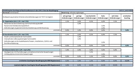 Die Bepunktung führt zu einem prozentualen Zuschlag auf das Grundhonorar in den Leistungsphasen 1 bis 5 der Leistungsbilder der HOAI. Die ergänzenden Standardleistungen BIM in den Leistungsphasen 6 bis 9 können derzeit noch nicht in einem Regelprozess abgebildet werden und werden deshalb als Besondere Leistungen definiert. Ein maximaler Zuschlag von 20 % wird aufgrund aufwandsbezogener Nachkalkulation von Projekten als angemessen gesehen.