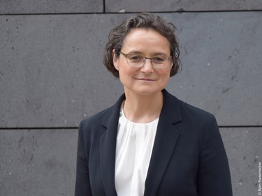 Blick über eine große, gepflasterte Fläche auf ein modernes Gebäude mit schrägen Stützen und Glasfassade, im Hintergrund Stadtgebäude und Bäume.