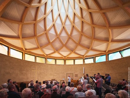 Freitreppe mit grasbedeckten Seitenflächen vor einem modernen, geschwungenen Gebäude mit weißer Fassade und dunklem Unterbau.