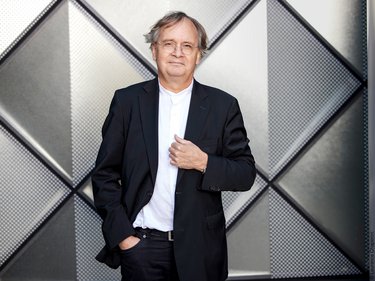 Mann mit dunklem Hemd und beiger Hose steht vor einer Glasfront mit Blick auf Garten und Bäume.