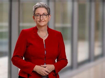 Zwei Personen in formeller Kleidung stehen nebeneinander vor einer modernen Gebäudefassade