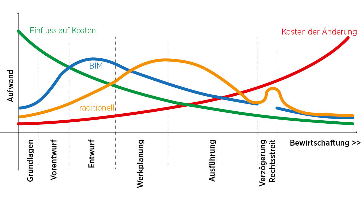 Das Thema Nachhaltigkeit wird in einem Projekt am besten möglichst früh betrachtet, seien es ökologische Aspekte wie eine CO₂-Neutralität, ökonomische wie eine Energie- und Kosteneffizienz oder soziale wie der thermische Komfort für Nutzer. Die oft zitierte MacLeamy-Kurve zeigt, dass der Mehraufwand für ein BIM-Projekt (und der Mehrwert aus den Modellen) in den Leistungsphasen 2 und 3 liegt. Das ist erstens vor dem Design-Freeze, also dem Ende des Entwerfens, und zweitens vor der Baueingabe. Diese zwei Meilensteine sind für nachhaltiges Bauen als „Point of no Return“ zu verstehen, weil danach weitere Optimierungen der Gebäudekubatur mit hohem Aufwand verbunden sind.