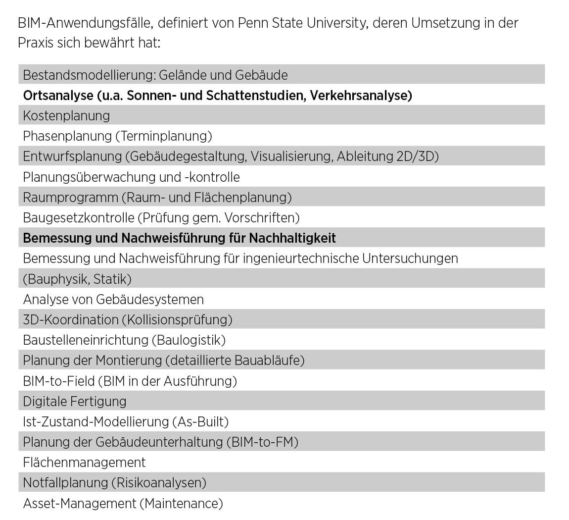 BIM ist bereits seit 2020 für alle Infrastrukturprojekte des Bundes verpflichtend. Für den Hochbau sieht der ,,Masterplan BIM‘‘ die verpflichtende Verwendung bei allen öffentlichen Bauten des Bundes vor (mit einer geplanten Umsetzung in mehreren Einführungsstufen ab 2022). Vorreiterprojekte im Bereich Hochbau nutzen BIM bereits umfassend und durchgängig über den kompletten Lebenszyklus des Gebäudes (Planen, Bauen, Betreiben). Dadurch können auch sehr hohe Nachhaltigkeits- und Energieeffizienzanforderungen in frühen Leistungsphasen untersucht, simuliert und planerisch optimiert werden.