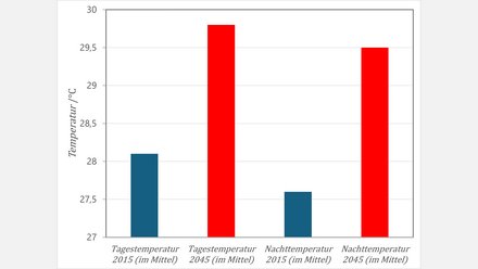 Deshalb wurden als Alternative die mittleren sommerlichen Tages- und Nachttemperaturen analysiert. Diese Kennwerte reagierten deutlich weniger empfindlich auf kleinräumige Wetterunterschiede. Außerdem machten sie gleichzeitig die Auswirkungen der für 2045 prognostizierten Klimaveränderung sichtbar. Für die Praxis der Bauplanung könnten sie also als verständlichere und robuster interpretierbare Ergänzung zu bestehenden Nachweisen herangezogen werden.