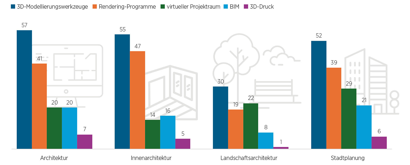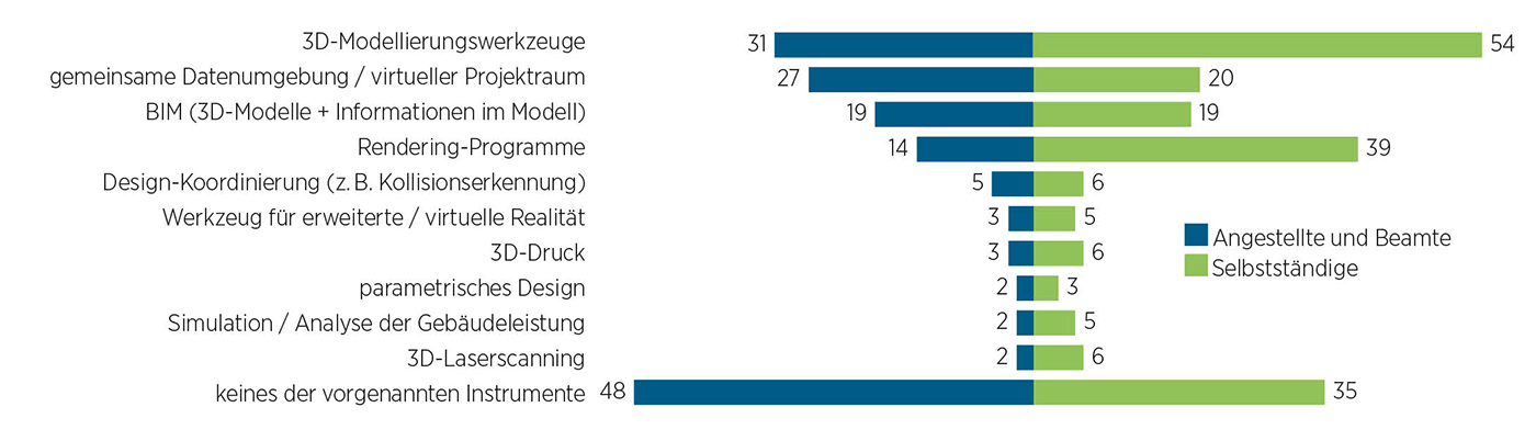 Befragung von 17.093 selbstständigen Kammermitgliedern (2024). Spezielle Planungsinstrumente für Landschaftsarchitektur sowie KI-Tools wurden nicht abgefragt, Angaben in Prozent.