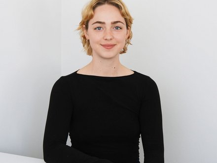 Person mit lockigem Haar hält ein großes Blatt mit technischen Zeichnungen oder Plänen vor sich.