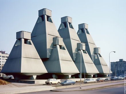 Blick über eine große, gepflasterte Fläche auf ein modernes Gebäude mit schrägen Stützen und Glasfassade, im Hintergrund Stadtgebäude und Bäume.