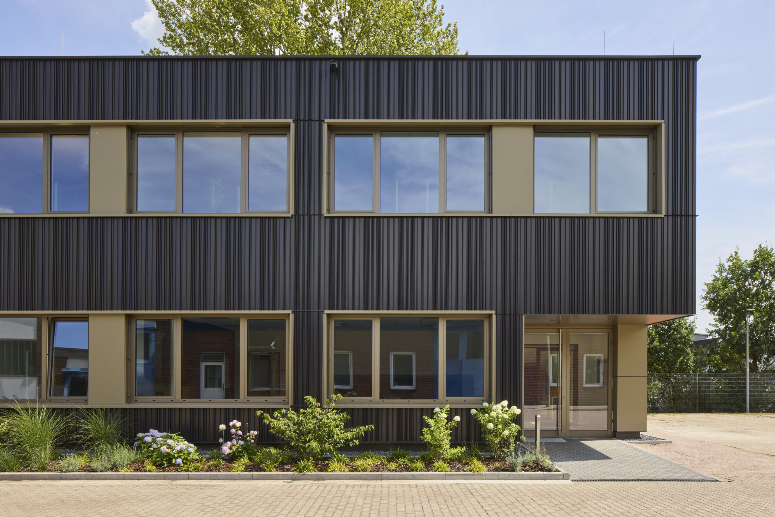 Besonders stolz sind Bauherrin und Planer auf die hochwertige Fassade des Gebäudes: „Hier ist uns die Kombination aus Eleganz und Robustheit besonders gut gelungen“, freut sich der Architekt. Die Metallfassade aus einem speziell gefertigten dunkel-bronzefarbenen Zackenpaneel verleiht dem Gebäude ein modernes, zeitloses Aussehen. „In Kombination mit den hell-bronzefarben abgesetzten Fensterbändern entsteht ein ästhetischer Look, der das Gebäude zu einem echten Blickfang in der Straße macht.“ Und noch mehr: „Die Fassade ist nicht nur optisch ansprechend, sondern zudem auch wartungsfrei“, betont Gänsicke, der das hochwertige Material unter anderem bereits beim Berufsbildungszentrum Schleswig mit ALHO erfolgreich eingesetzt hat. „Das bedeutet für den Auftraggeber langfristig weniger Aufwand und damit weniger Kosten.“