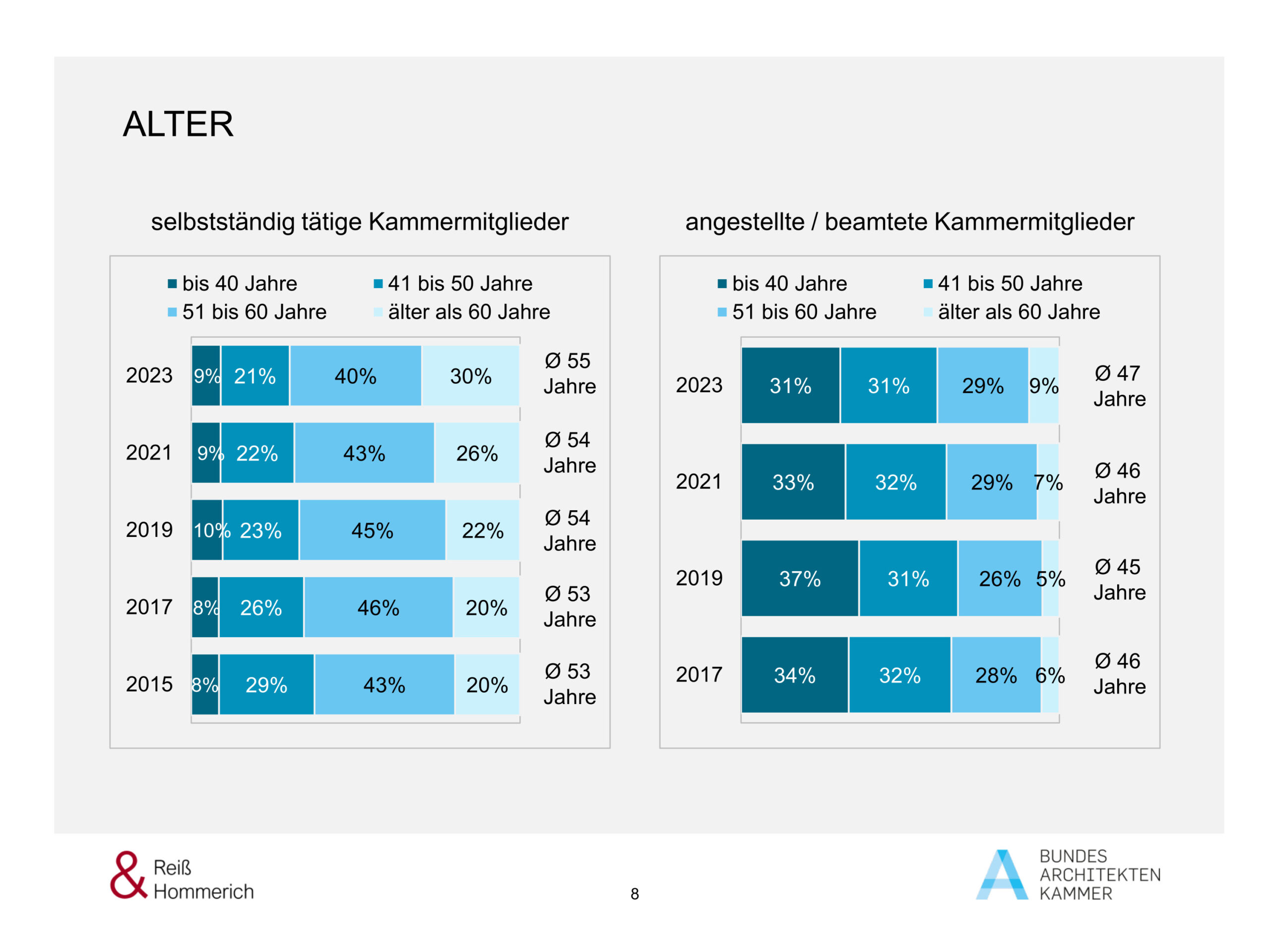 Seit 2019 steigt das Durchschnittsalter der angestellten und beamteten Kammermitglieder kontinuierlich an (2019: 45 Jahre / 2021: 46 Jahre / 2023: 47 Jahre). Angestellte im öffentlichen Dienst sind mit ø 51 Jahren die älteste, Angestellte in Architektur- / Planungsbüros mit ø 43 Jahren die jüngste Gruppe unter den abhängig beschäftigten Kammermitgliedern.