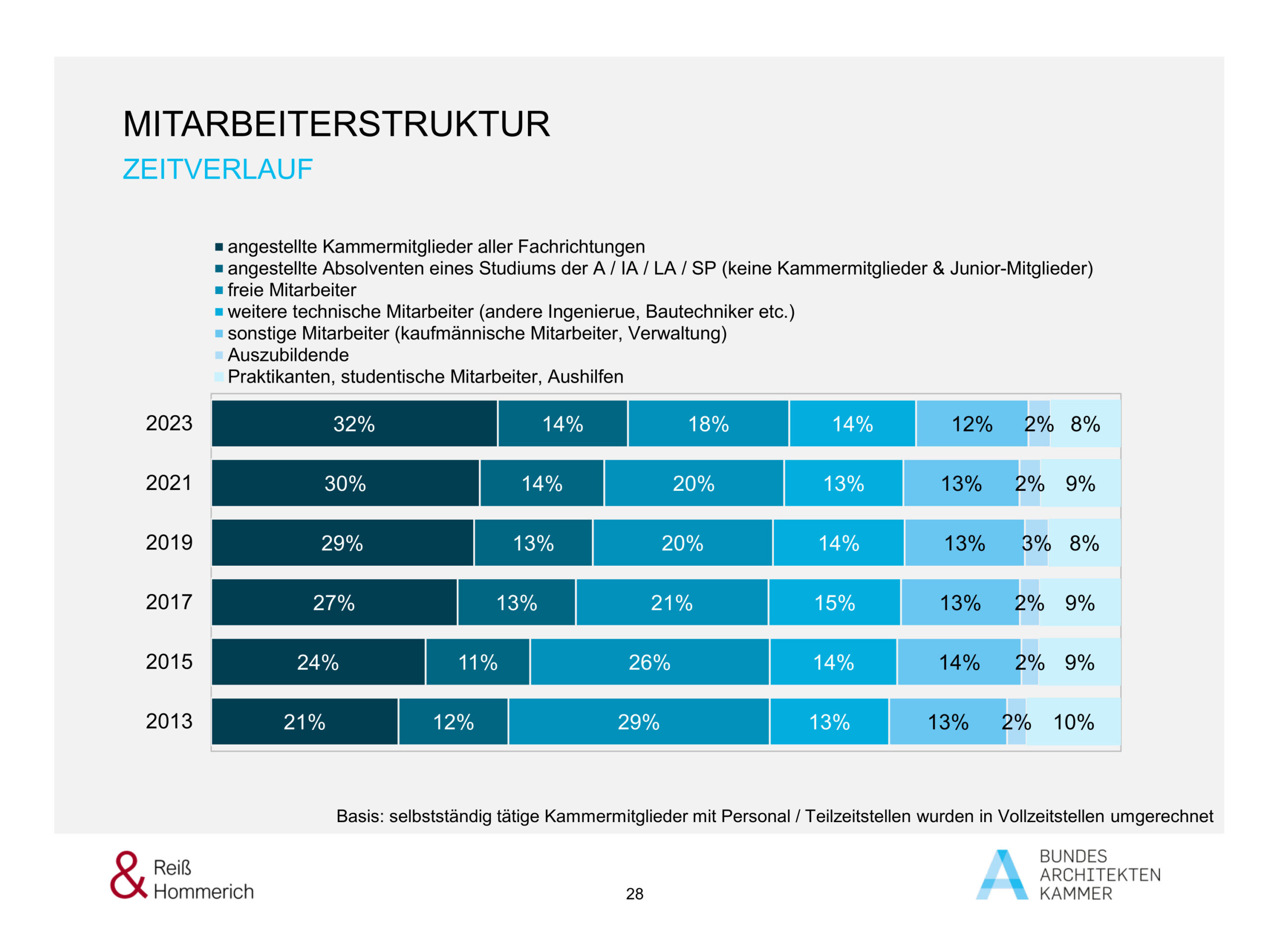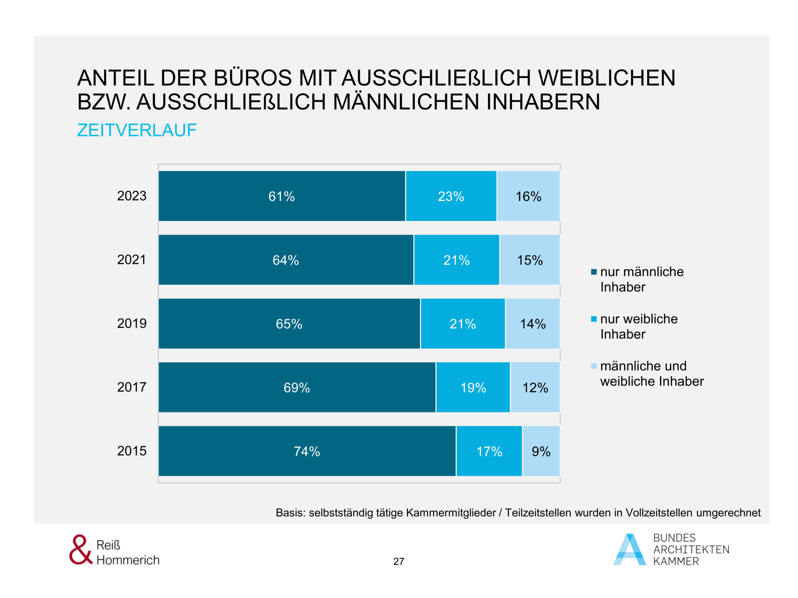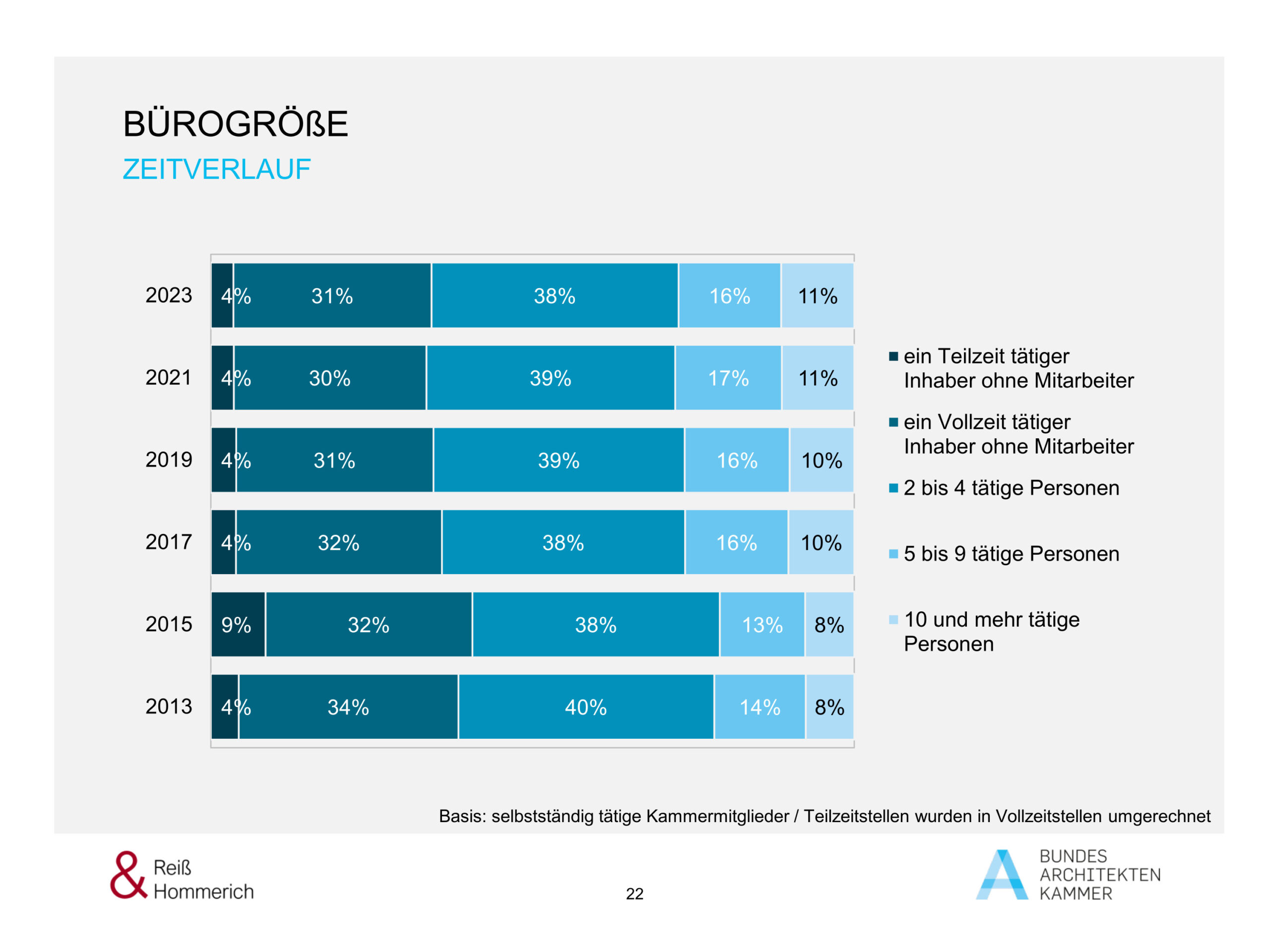 Der Anteil größerer Büros steigt allerdings. Lag der Anteil der (Mit-)Inhaber von Büros mit 5 und mehr Tätigen 2013 und 2015 noch bei knapp über 20%, liegt er inzwischen bei 27%.