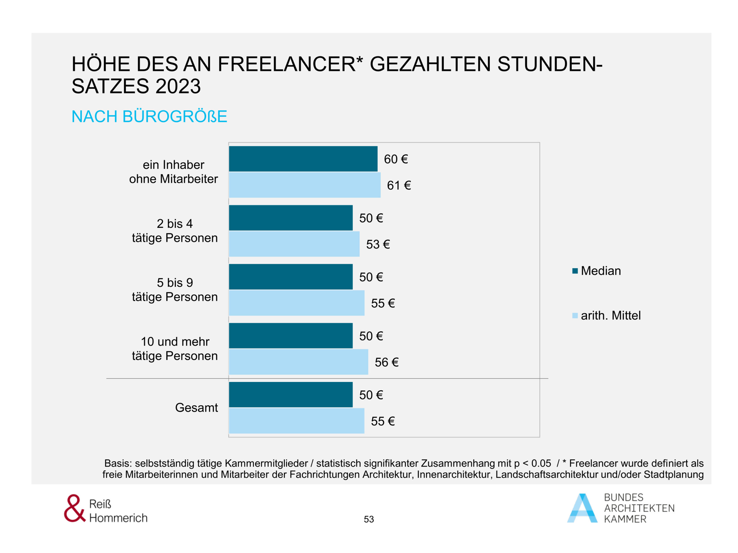 Alle Stundensätze sind seit dem Berichtsjahr 2015 deutlich gestiegen (Inhaber: +27%, angestellte Kammermitglieder: 31%, angestellte Nicht-Kammermitglieder: +36%, technische Beschäftigte : +38%). Größere Büros rechnen in nahezu allen Kategorien höhere Stundensätze ab als kleinere Büros. Freelancer erhielten von den Büros im Mittel ein Stundenhonorar von 50 €.