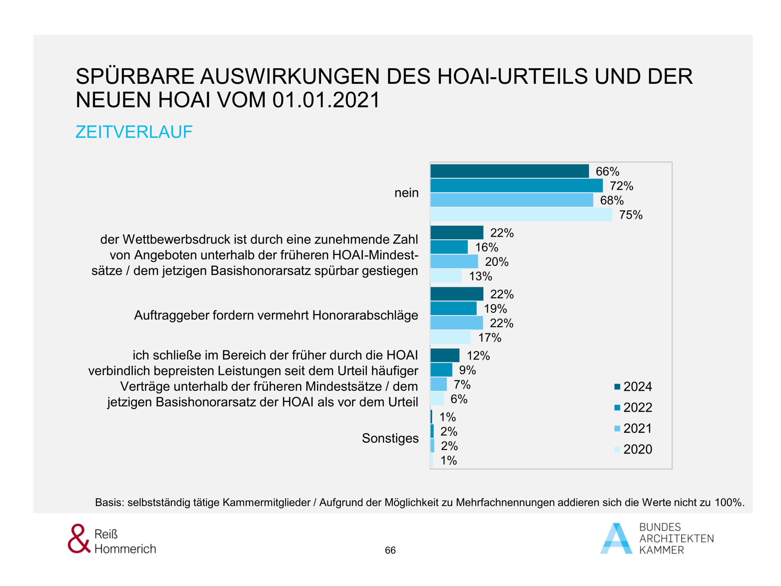 Seit dem Berichtsjahr 2017 ist der Anteil der auf Basis der HOAI abgerechneten Honorare deutlich von 70% über 59% und 57% auf jetzt 49% gesunken. Der Vergleich des Berichtsjahrs 2023 mit den Vorjahren ist jedoch mit Vorsicht zu interpretieren, da für das Berichtsjahr 2023 die Kategorie „fixes Honorar / Pauschalhonorar“ neu aufgenommen wurde.