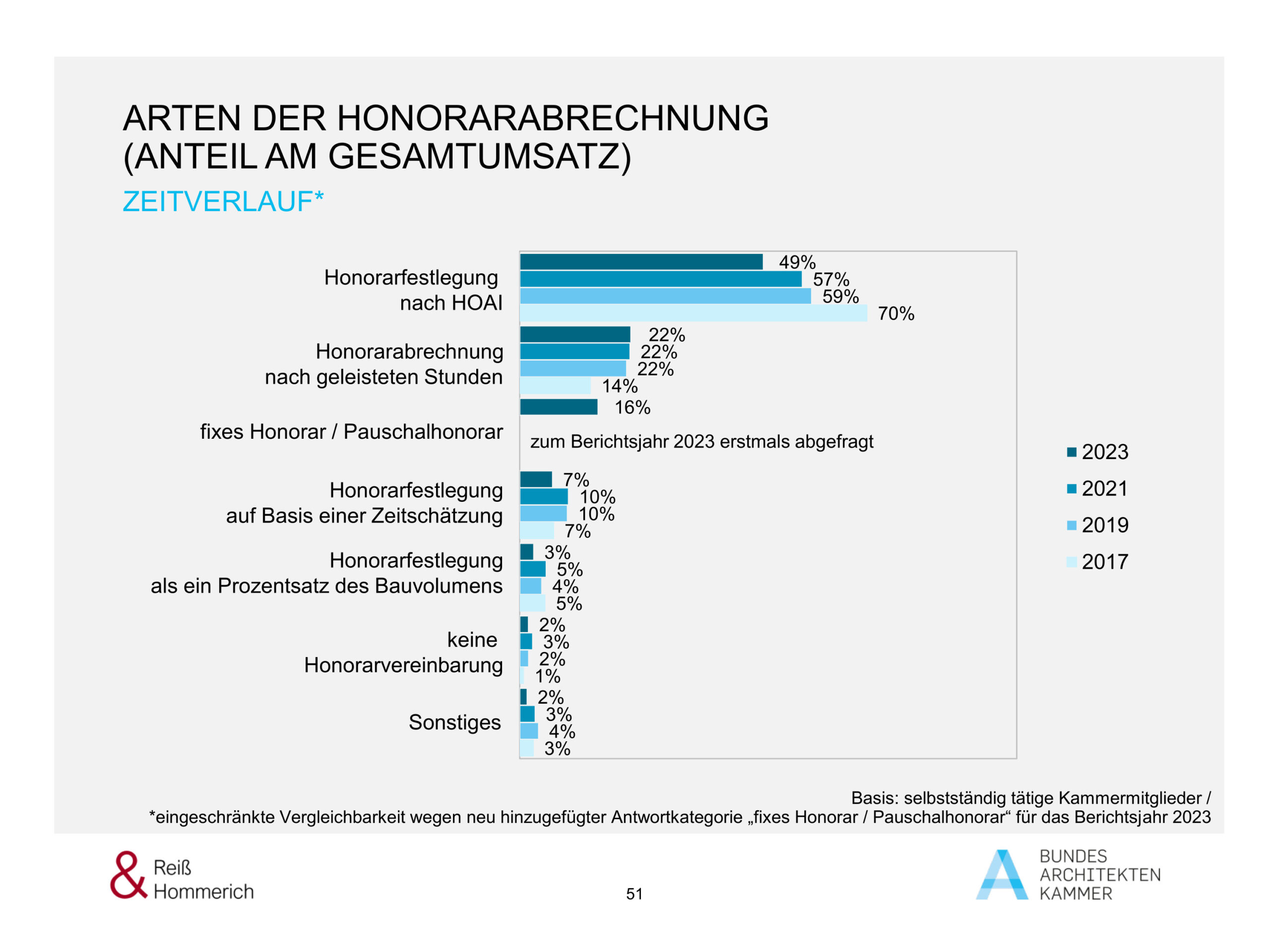 Durchschnittlich 49% der Honorare wurden 2023 auf Basis der HOAI abgerechnet. 22% wurden auf Basis geleisteter Stunden abgerechnet. Bei 16% handelte es sich um ein Pauschalhonorar. 7% gingen auf ein Honorar auf Basis einer Zeitschätzung zurück. Das Bauvolumen diente bei 3% der Honorare als Berechnungsgrundlage.