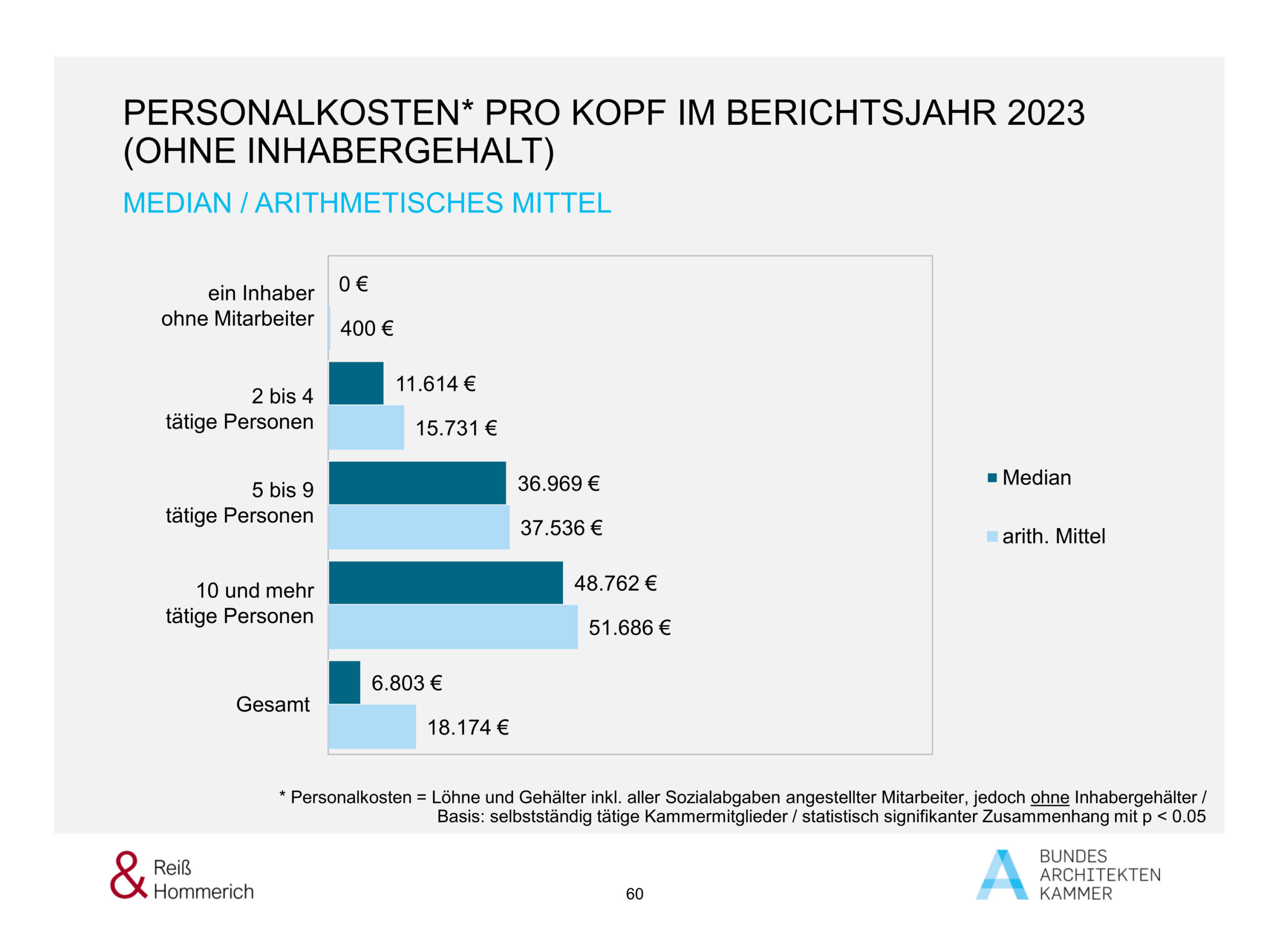 Das durchschnittliche Gehalt vollzeittätiger angestellter und beamteter Kammermitglieder lag 2023 bei rund 74.000 € (arithmetisches Mittel), das weniger ausreißeranfällige mittlere Gehalt bei 68.000 € (Median).