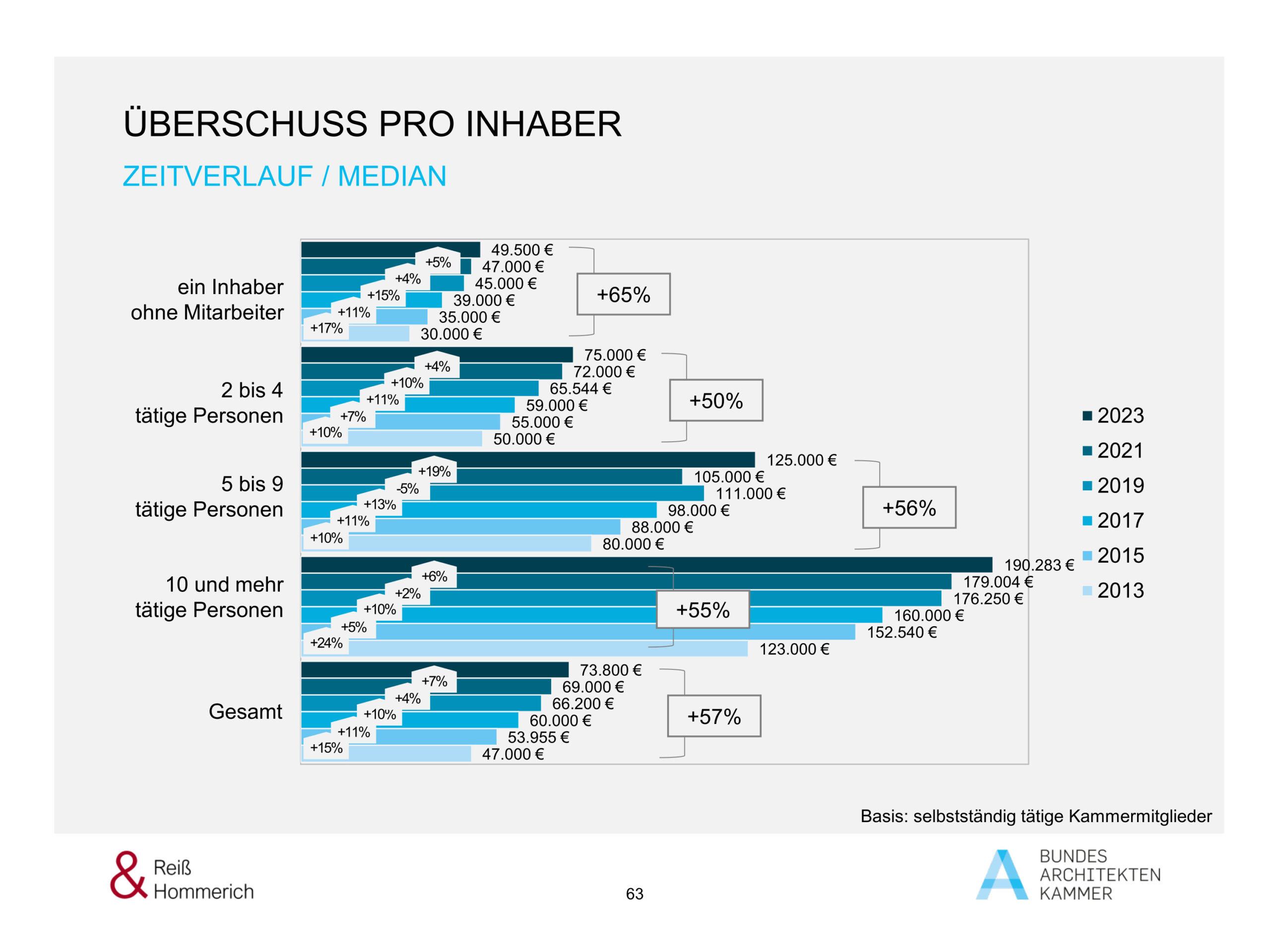 Die (aus den Angaben der Befragten zu Umsätzen und Kosten abgeleiteten) Überschüsse je Inhaber lagen 2023 im Mittel bei 74.000 €. Mit zunehmender Bürogröße steigen sie von 49.500 € in Ein-Personen-Büros über 75.000 € in Büros mit 2 bis 4 tätigen Personen und 125.000 € in Büros mit 5 bis 9 tätigen Personen auf rund 190.000 € in Büros mit 10 und mehr tätigen Personen. Seit 2013 sind die mittleren Überschüsse je Inhaber um 57% gestiegen.