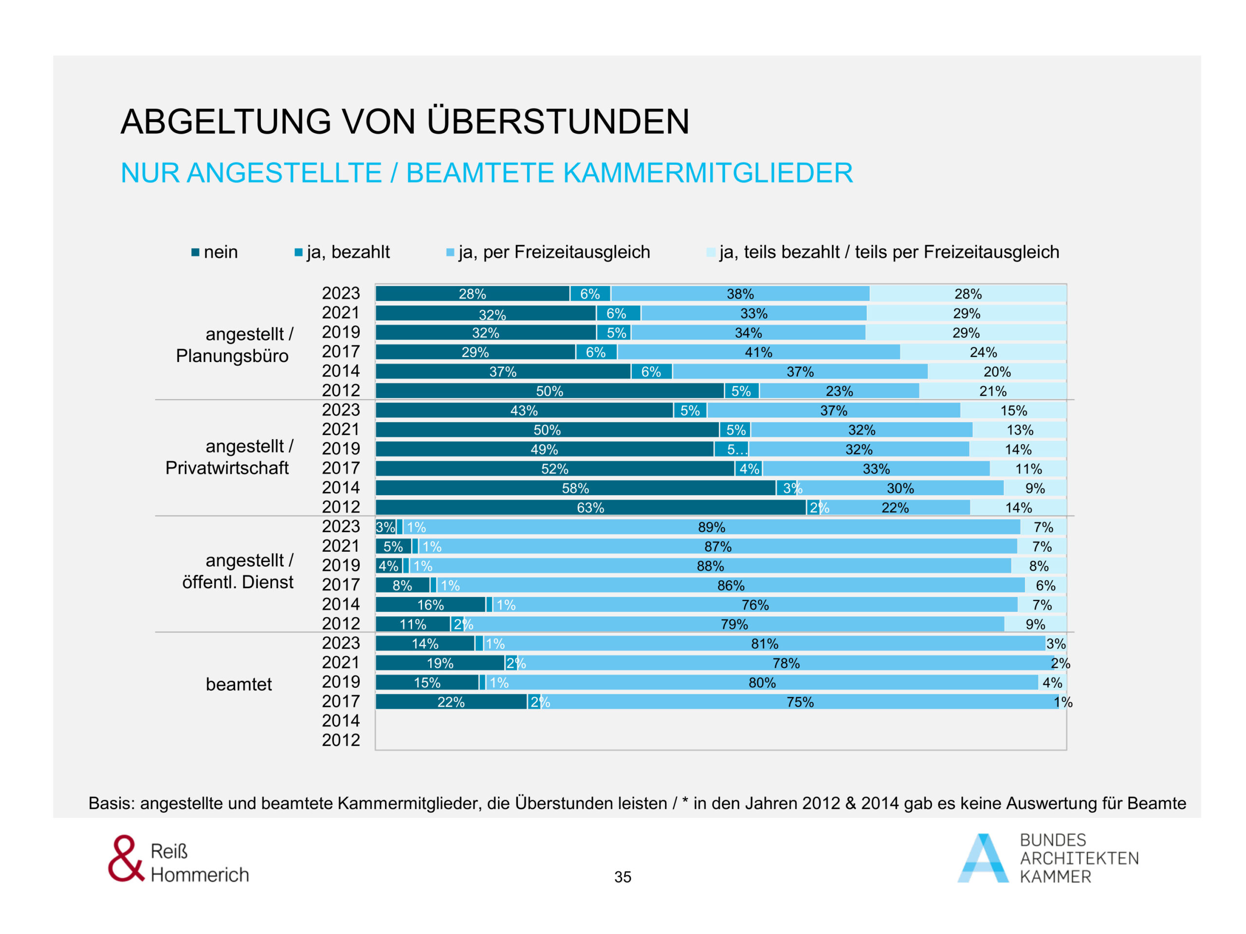 75% der Beschäftigten, die Überstunden leisten, bekommen diese abgegolten: 52% ausschließlich per Freizeitausgleich, 23% (auch) finanziell. Hier gibt es deutliche Unterschiede je nach Art der abhängigen Beschäftigung. Knapp jeder zweite Angestellte in der gewerblichen Wirtschaft gibt an, angesammelte Überstunden würden nicht abgegolten. 28% der Angestellten in Architektur- / Planungsbüros erhalten keinen Ausgleich für Überstunden, 14% der Beamten und 3% der Angestellten im öffentlichen Dienst, wobei die Werte unterhalb der Messwerte von vor 2 Jahren liegen.