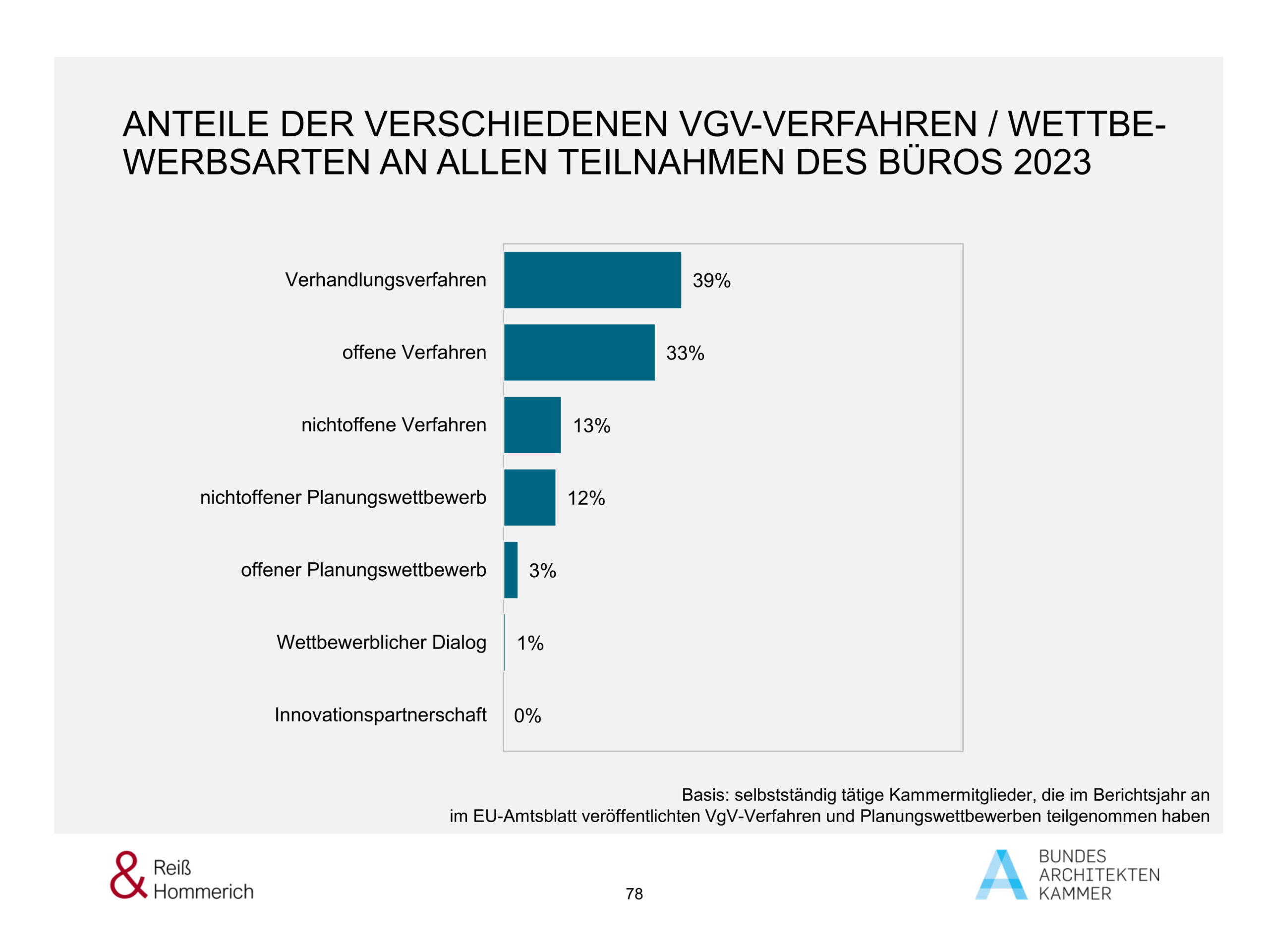 Nahezu alle Wettbewerbsteilnahmen bezogen sich auf Wettbewerbe in Deutschland (95%). Bei 4% handelte es sich um Wettbewerbe im EU-Ausland, bei 1% um Wettbewerbe außerhalb der EU. An im EU-Amtsblatt veröffentlichten VGV-Verfahren und Planungswettbewerben beteiligten sich im letzten Jahr 8% der selbstständig tätigen Kammermitglieder. Größere Büros sowie Landschaftsarchitekten und Stadtplaner nahmen häufiger teil als andere. Wer an im EU-Amtsblatt veröffentlichten VGV-Verfahren und Planungswettbewerben teilnahm, beteiligte sich im Schnitt an 12 Verfahren / Wettbewerben. Das ist ein deutlicher Anstieg gegenüber 2021 (Ø 6 Verfahren / Wettbewerbe).