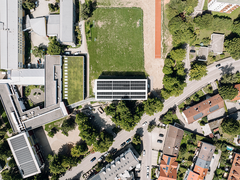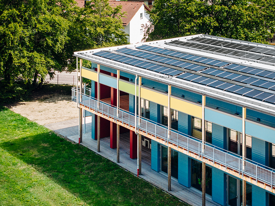Das Obergeschoss entspricht dem Erdgeschoss, ergänzt um einen außenliegenden Aufzugsturm und Laubengangerschließung. Für die Aufstockung wurde das Dach temporär entfernt und anschließend wieder aufgesetzt. Der große Dachüberstand sorgt für sommerlichen Wärmeschutz, die gesamte Fläche wurde mit PV-Modulen belegt – auch das benachbarte Schulgebäude profitiert energetisch.