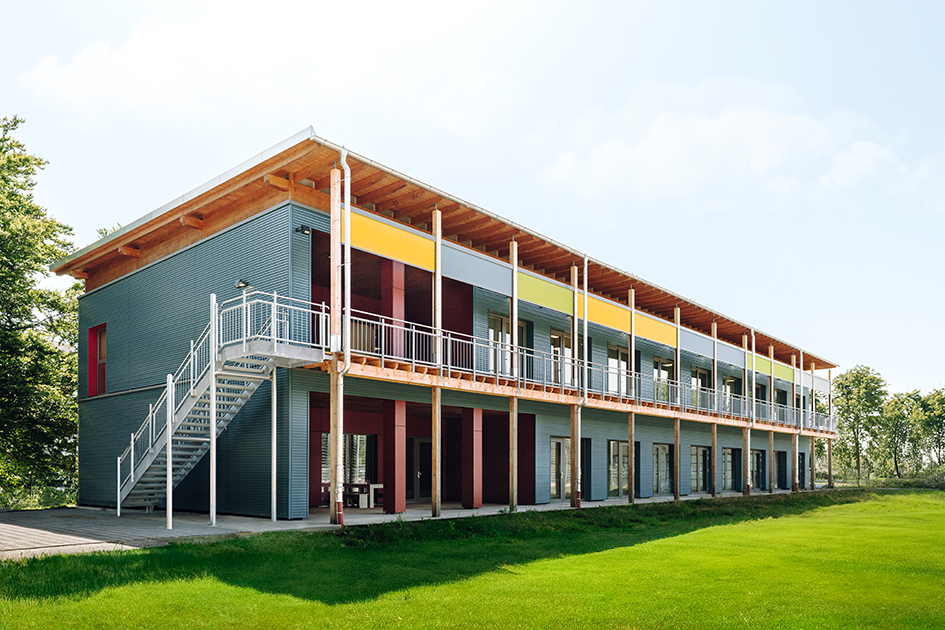Die modulare Bauweise ermöglichte eine urbane Nachverdichtung ohne zusätzlichen Flächenverbrauch. Der langgestreckte Baukörper im Stil einer Flurschule wurde am Rand des Grundstücks platziert, um das Schulgelände und die Sportflächen zu schonen. Statt eines Flachdachs entschied sich die Stadt für ein Pultdach aus Holz – gestalterisch anspruchsvoll und funktional sinnvoll. Die Fassadenschalung aus Lärchenholz integriert das Gebäude optisch ins Ortsbild.
