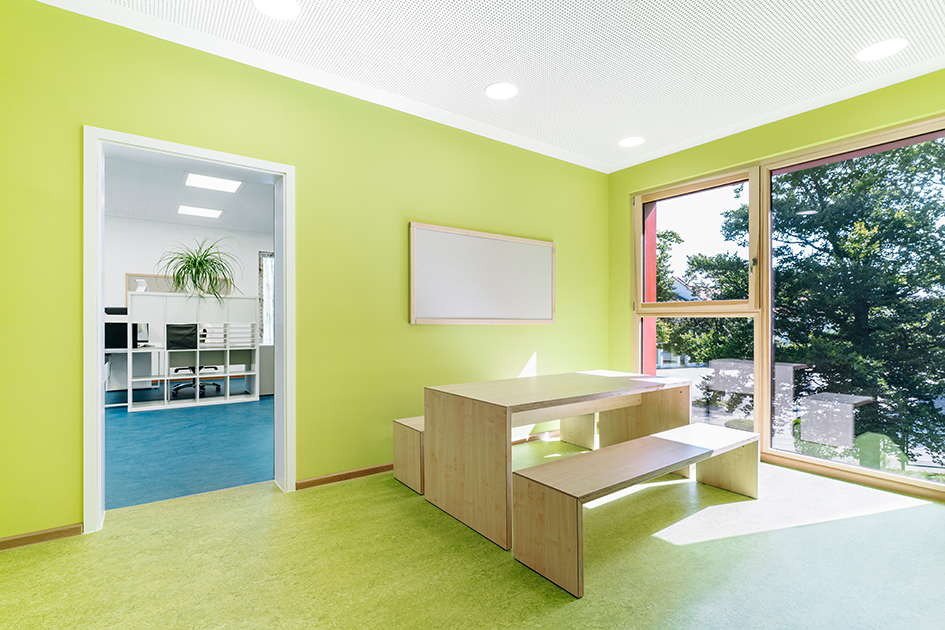 Innen dominieren helle Grüntöne und großzügige Fensterflächen, die das Gebäude freundlich und kindgerecht wirken lassen. Außen sorgen Holz und pastelliges Blau für eine ruhige, ortsbezogene Gestaltung. Ein überdachter Außenbereich ermöglicht Spielen bei jedem Wetter.