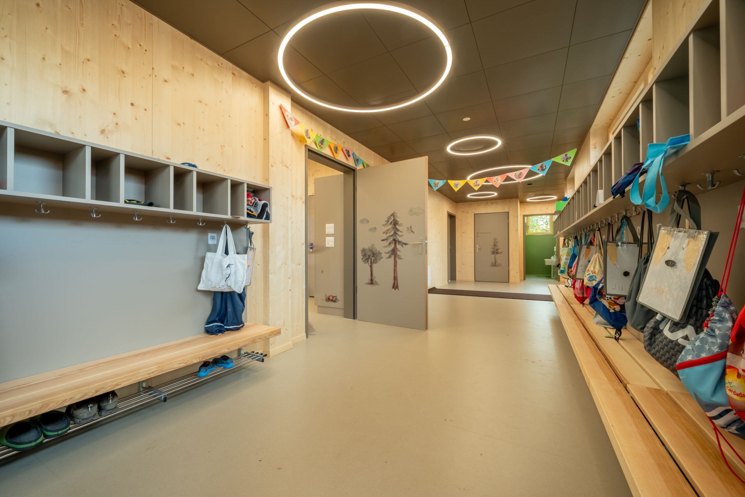 Der eingeschossige Neubau des Kindergartens fügt sich nahtlos in die bestehende Bebauung und die umgebende Natur ein. Der Korridor des Neubaus mit integrierter Garderobe schafft durch sichtbares Holz ein einladendes Ambiente.