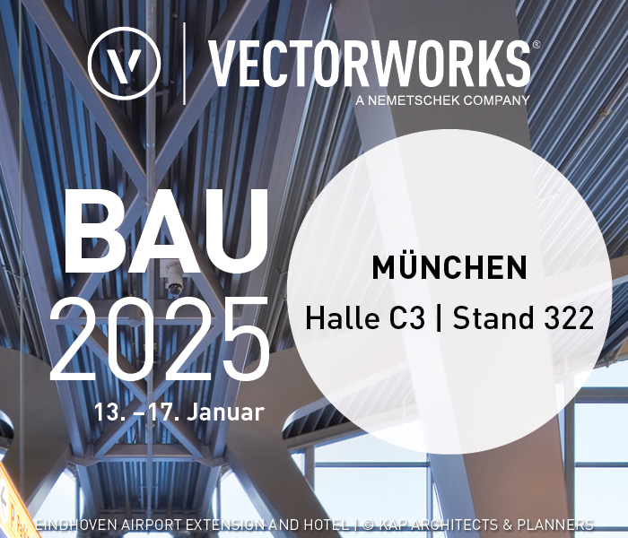 Vom 13. bis 17. Januar 2025 präsentiert ComputerWorks GmbH die wichtigsten und aktuellen Werkzeuge und Funktionen der All-in-one-Software Vectorworks auf der BAU-Messe in München. Am Gemeinschaftsstand der Nemetschek-Group in Halle C3 erfahren Besucher:innen alles zu KI-Visualisierungen, effizienter Kreislaufwirtschaft, BIM-Workflows, den Neuerungen der Version 2025 und vielem mehr.
