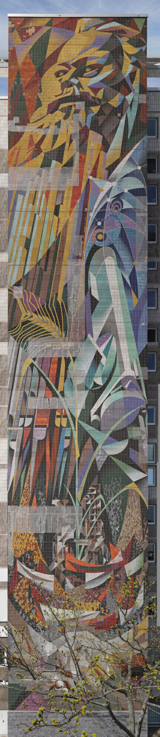 Dort ist der Anblick dafür umso beeindruckender, zuerst auf das Mosaik „Die von Menschen beherrschten Kräfte von Natur und Technik“ am südlichen Treppenturm. Die Motive sind typisch für sozialistische Staatskunst: Wohnungsbau, Technik, Industrie und Raumfahrt als Zeichen für gesellschaftlichen Fortschritt. Außerordentlich ist jedoch der künstlerische Stellenwert. Nicht nur, weil der vor der Franco-Diktatur aus Spanien (über Mexiko) in die DDR übergesiedelte Josep Renau im spanischsprachigen Raum ein bekannter Name ist und es in Deutschland nur noch vier bekannte baukünstlerische Werke von ihm gibt (eben die zwei hier, ein weiteres in Halle nahe des Hauptbahnhofs und eins in Erfurt).