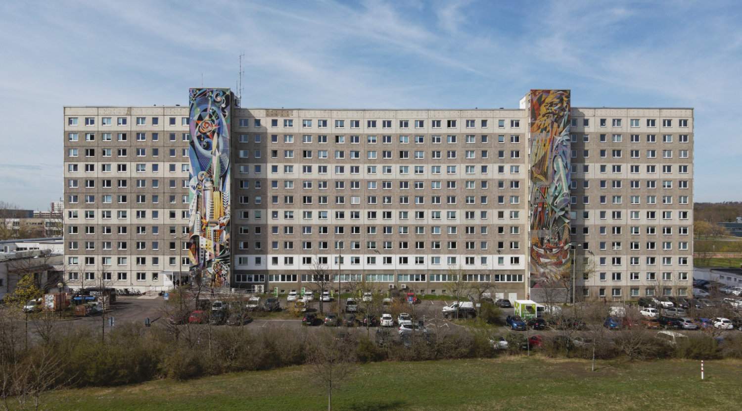 Die beiden monumentalen Mosaikbilder von Josep Renau sind immerhin 35 Meter hoch und trotzdem nicht so einfach zu finden. Das hat auch damit zu tun, dass die städtebauliche Planung von Halle-Neustadt an dieser Stelle nur noch schwer erkennbar ist. Vom Zentrum mit den fünf markanten Scheibenhochhäusern aus muss man um das obligatorische und weit ausladende Nachwende-Shoppingcenter herum, an ein paar neueren Wohnhäusern vorbei und eine leichte Anhöhe hinauf bis zu einem Behördenparkplatz.