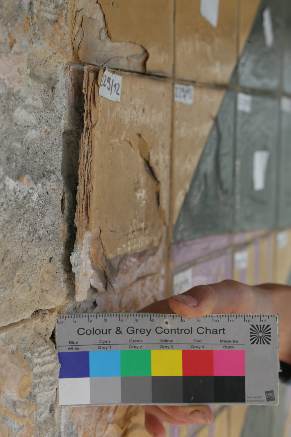 Probleme macht jedoch die Befestigung der Fliesen. Einerseits, weil die Dehnungsfugen des Mosaiks nicht überall deckungsgleich mit den Fugen zwischen den Betonplatten des Treppenturms waren. Andererseits weil es im Mörtel unter den Fliesen Hohlräume gibt, die mit einem Klopftest gefunden werden. Das Ergebnis: Etwa die Hälfte der 10.904 Fliesen (232 Reihen à 47 Fliesen) muss gesichert werden. Idealerweise geschieht das, ohne sie entfernen zu müssen, indem per Spritze ein Spezialmörtel injiziert wird.