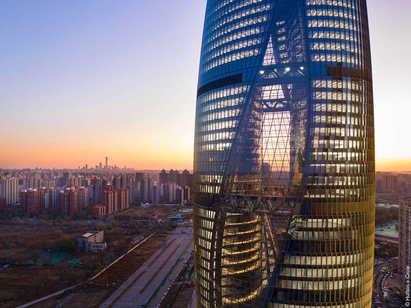 Das 194,15 Meter hohe Atrium des Leeza SOHO in Beijing ist das höchste der Welt und dient als öffentlicher Raum für das Viertel. Dynamisch um 45 Grad rotierend teilt es das Gebäude auf ganzer Höhe in zwei Bereiche, die über Brücken miteinander verbunden sind. Der 45 Stockwerke hohe Turm bietet flexible Büroflächen für kleine und mittlere Unternehmen und ist Zentrum des neuen Fengtai-Geschäftsviertels, eines wachsenden Finanz- und Mobilitätszentrums unweit des kürzlich eröffneten Flughafens im Südwesten der Stadt. Aufgrund der Nähe zum lokalen Bahnhof ist der Turm zum einen optimal an das Nahverkehrsnetz der Stadt angeschlossen, zum anderen verläuft direkt unter dem Turm eine U-Bahn-Strecke, die ihn im vierten Untergeschoss diagonal teilt. Dies beeinflusste das Design des Leeza Soho Turms nachhaltig und ist der Grund dafür, dass das Volumen des Hochhauses in zwei Hälften geteilt ist. Jede der beiden Hälften hat einen eigenen strukturellen Kern mit außenliegenden Stützen und stählernem Zugring, der der gekurvten Außenstruktur des Turms folgt.