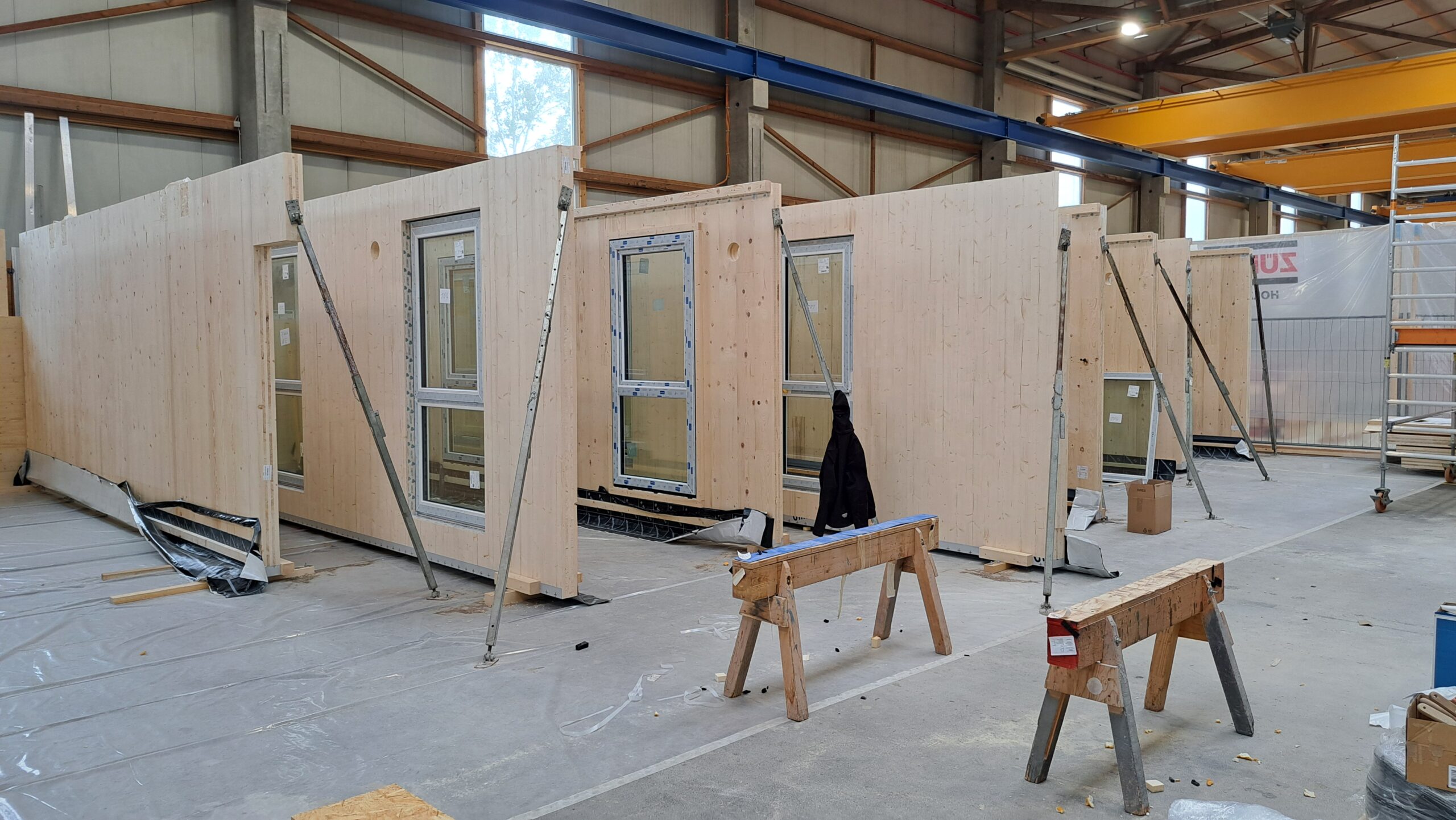 Serielle Vorfertigung im Züblin Timber Werk in Aichach.