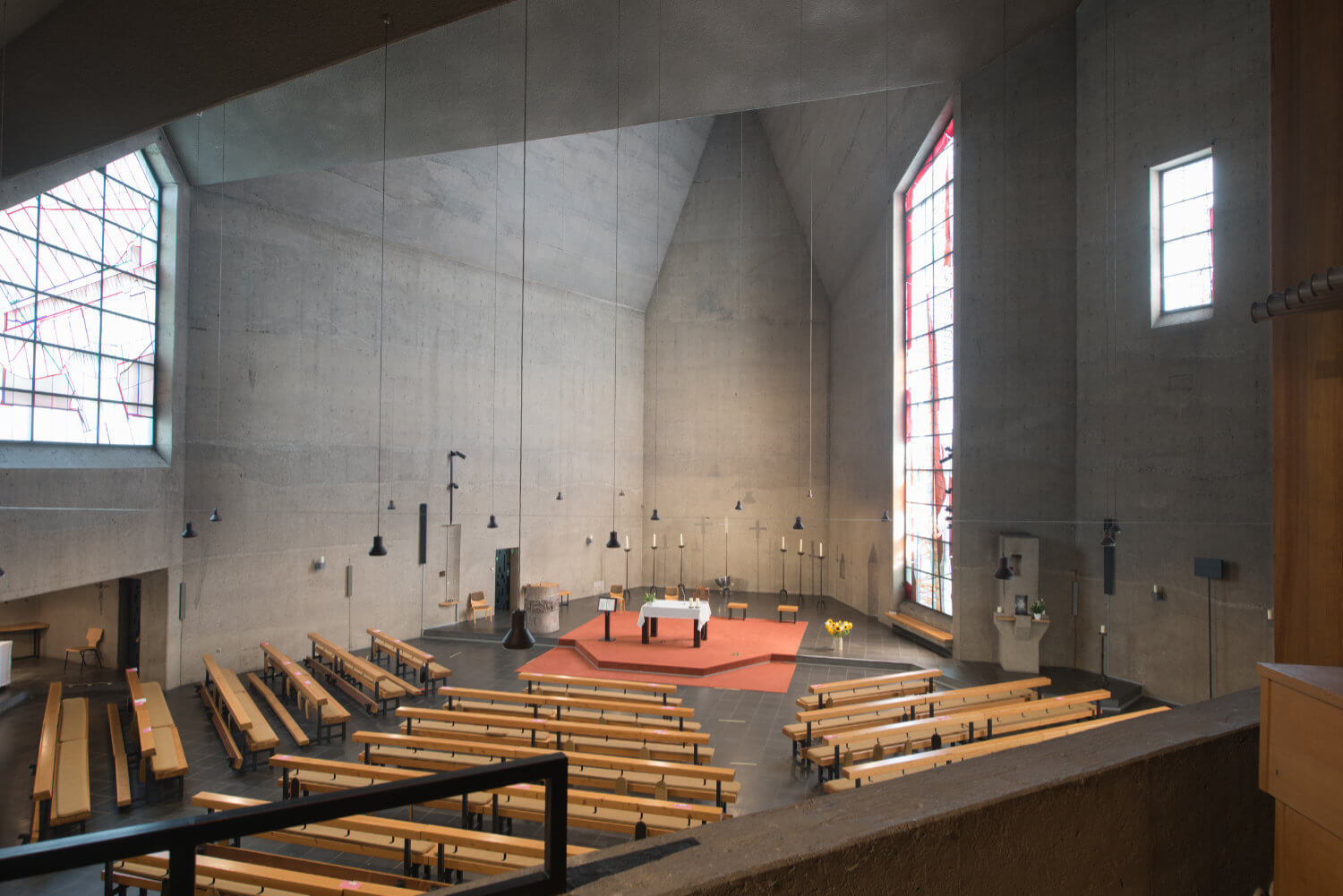 Hinzu kommt unter der Orgelempore ein Ausstellungsbereich, der sich Leben und Werk Gottfried Böhms widmet und St. Hubertus darin einordnet. In der Taufkapelle werden schließlich fünf Nutzungskonzepte und Entwürfe gezegt, die die Studierenden als mögliche Zukunft für St. Hubertus entwickelt haben.